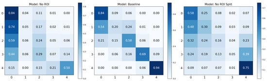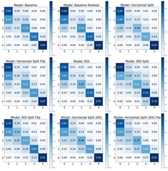 Our analysis has highlighted the marked effectiveness of certain positive data augmentations in improving model performance. Specifically, the ‘Baseline Rotated’ model showed the highest accuracy but second-best recall. Incorporating rotation into our baseline model could have increased its robustness to orientation changes in the images, contributing to its superior accuracy. Furthermore, the confusion matrix analysis demonstrated excellent recall for the KL0 and KL4 grades, a result that may be associated with the distinct radiographic features of these classes. Conversely, the ‘Horizontal Split’ model, which divided the image into two parts along the horizontal axis, performed the worst across all considered metrics. This could be because this approach might eliminate or distort crucial radiographic features, thereby reducing the model’s ability to classify the images accurately. Notably, the results contradicted our initial expectation that the ROI models would outperform the baseline models, given the assumption that focusing on specific regions containing more relevant information would increase performance. However, the results indicated that models utilizing the entire image data might have a slight edge in performance over those focusing on a particular ROI, suggesting that potentially important information outside the ROI might be missed, or that confounds are integrated, inflating the performance.
