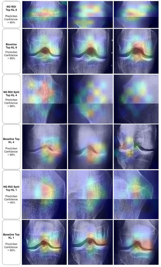 Further insights from our Grad-CAM visualization analysis indicate potential confounding regions that might affect our models’ decision-making processes. Notably, in the absence of a designated region of interest (ROI) for KL0, the models tend to focus on the texture and contours of the patella. Interestingly, this pattern shifts with the baseline KL0 models, where the joint and its eminence are distinctly highlighted. However, the spread of activation that extends broadly across and above the knee joint suggests the model might be considering features beyond the knee joint for classification. In the No ROI Split KL4, the model appeared to be using general wear-and-tear texture indications for their classifications, which may not be directly related to disease progression but rather to the participant’s age. Finally, in the KL1 category, the models oscillate between specific and non-specific textures, further underscoring potential confounding regions.