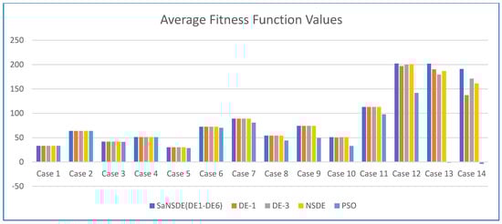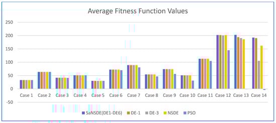 The results in Table 6 show that the top four algorithms are SaNSDE-1-6, NSDE, DE-1 and DE-3. For small test cases, including Case 1 through Case 11, the fitness function values obtained using SaNSDE-1-6, NSDE, DE-1 and DE-3 are the same. However, as the problem size grows, the average fitness function values obtained via SaNSDE-1-6 are significantly better than those obtained via NSDE, DE-1 and DE-3. For Case 12, the average fitness function value obtained via SaNSDE-1-6 is better than those obtained by NSDE, DE-1 and DE-3. The differences between the average fitness function value obtained via SaNSDE-1-6 and those obtained via NSDE, DE-1 and DE-3 are about 0.1674% to 0.73959%. For Case 12, the average fitness function value obtained via SaNSDE-1-6 is better than those obtained via NSDE, DE-1 and DE-3. For Case 13, the differences between the average fitness function values obtained via SaNSDE-1-6 and those obtained via NSDE, DE-1 and DE-3 are about 4.00326% to 7.9796%. For Case 14, the differences between the average fitness function value obtained via SaNSDE-1-6 and those obtained via NSDE, DE-1 and DE-3 are about 3.1171% to 46.403%. In short, SaNSDE-1-6 outperforms NSDE, DE-1 and DE-3 in terms of scalability. To compare performance clearly, please refer to the bar chart shown in Figure 10 for the average fitness function values of Case 1 through Case 14.