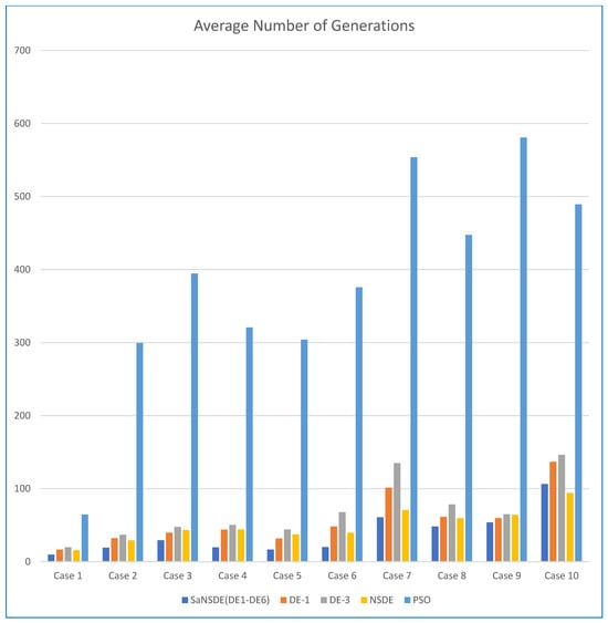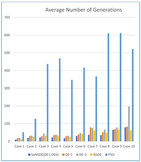 In terms of convergence rate (the number of generations to find the best solutions), the results in Table 7 indicate that the average numbers of iterations for SaNSDE-1-6 to find the best solutions are significantly less than those for NSDE, DE-1 and DE-3 to find the best solutions for most test cases (with some exception). This indicates that SaNSDE-1-6 outperforms NSDE, DE-1 and DE-3 in convergence rate. To compare the convergence rate clearly, please refer to the bar chart shown in Figure 11 for the average number of generations of Case 1 through Case 10 and please refer to the bar chart shown in Figure 12 for the average number of generations of Case 11 through Case 14.