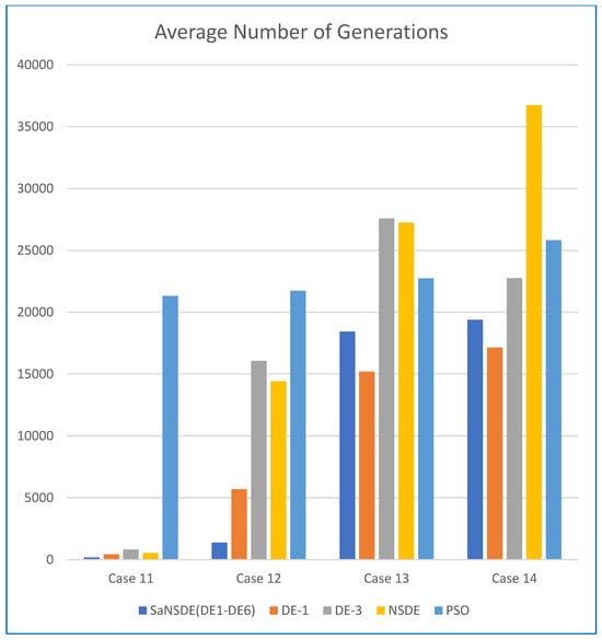 The results presented above are based on comparison of average number of generations. The results in Table 8 indicate that the average computation time for SaNSDE-1-6 to find the best solutions is significantly less than that for PSO to find the best solutions for Case 1 through Case 10 and is greater than those of NSDE, DE-1 and DE-3 for Case 1 through Case 10. This indicates that SaNSDE-1-6 outperforms PSO in terms of computation time for Case 1 through Case 10 and NSDE, DE-1 and DE-3 outperform SaNSDE-1-6 in terms of computation time for Case 1 through Case 10. For Case 11 and Case 12, SaNSDE-1-6 outperforms PSO, NSDE, DE-1 and DE-3 in terms of computation time. For Case 13 through Case 14, PSO, NSDE, DE-1 and DE-3 outperform SaNSDE-1-6 in terms of computation time. As the experiments to compare the different algorithms were done on the same platform as the one used in [], which was an old laptop delivered in 2019 with Intel(R) Core(TM) i7 CPU, base clock speed of 2.6 GHz and16 GB of onboard memory, the computation times of SaNSDE-1-6 are much longer for Case 12, Case 13 and Case 14. Obviously, a more powerful computer or a server class computer is required to apply the SaNSDE-1-6 algorithm.