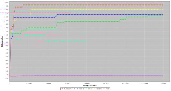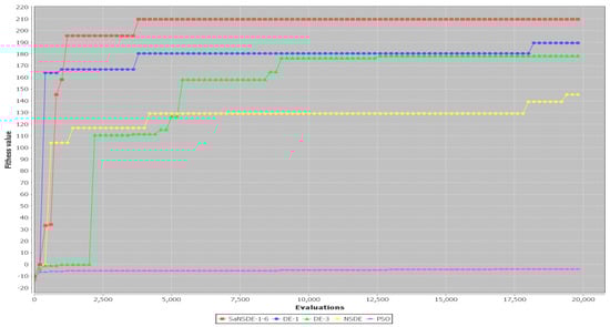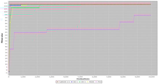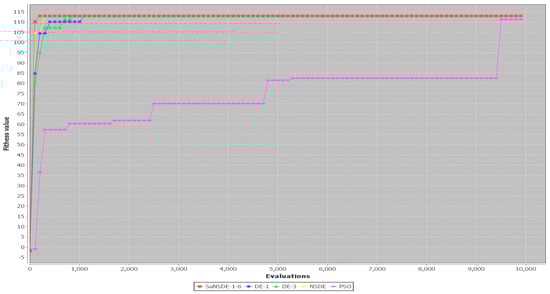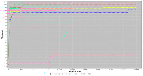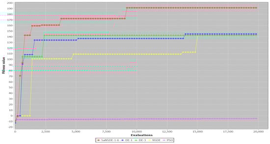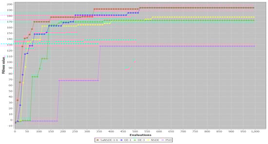 Fitness function values for discrete SaNSDE-1-6,DE-1, DE-3, NSDE and PSO algorithms with = 50; = = 0.1.