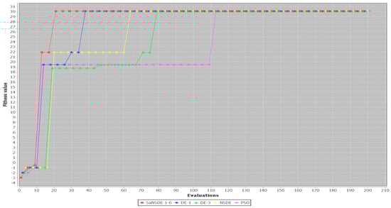Fitness function values for discrete SaNSDE-1-6,DE-1, DE-3, NSDE and PSO algorithms with NP = 30; = = 0.1.