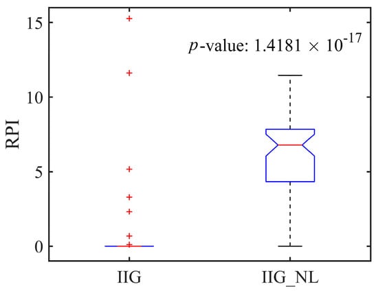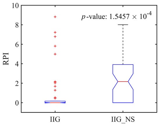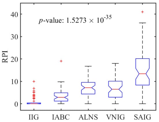 To evaluate the performance of the local search strategy, an IIG algorithm without the local search strategy (IIG_NL) was developed and compared to the IIG algorithm. The two compared algorithms were run independently 30 times on 56 instances, and the average fitness values for each instance are collected. The relative percentage increase (RPI) is used to measure the algorithm’s performance, which is calculated by Equation (14) as follows: