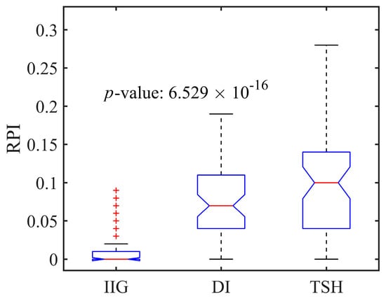 Currently, the optimal solution for Solomon instances is constantly being refreshed by many researchers. Among them, Rochat et al. [] proposed the diversification and intensification technique (denoted as DI), while Bent et al. [] proposed the two-stage hybrid algorithm (denoted as TSH). These two heuristic algorithms obtained the highest number of optimal solutions across all 56 Solomon instances. As discussed above, our test instances were expanded from Solomon instances. Therefore, to evaluate the performance of our algorithm, we selected the DI and TSH algorithms to solve R-VRPTWLST and compared the results with those obtained by the IIG. For each expanded instance, the compared algorithm was run independently 30 times, and the optimal fitness value is recorded in Table 7. In Table 7, the first column represents the expanded instances and the second column provides the best fitness value achieved among the compared algorithms for each instance. The next six columns provide the optimal fitness values and corresponding RPI values of the compared algorithms. It can be seen that (1) the proposed IIG obtained 39 optimal fitness values out of 56 instances, significantly outperforming the other two algorithms. (2) The average RPI value of the IIG algorithm is 0.01, which is 0.14 and 0.1 times those of the DI and TSH algorithms, respectively. This demonstrates that the proposed IIG algorithm is effective in solving the R-VRPTWLST. Figure 6 presents an ANOVA comparison of the three algorithms, showing a p-value of 6.529 × 10−16, which is much lower than 0.05, indicating significant differences among the three algorithms.
