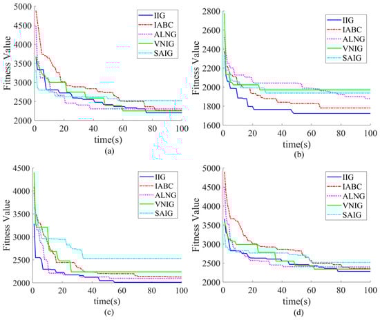 Comparisons of the convergence curves for the compared algorithms. (a) Curves for instance rc105; (b) curves for instance rr103; (c) curves for instance rrc107; (d) curves for instance rrc208.