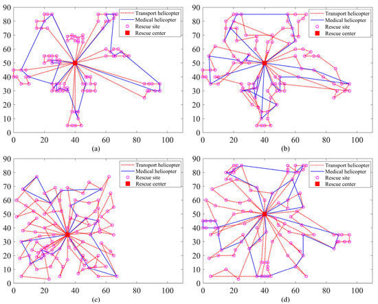 The obtained helicopter routings for the four selected instances. (a) Chart for instance rc106; (b) chart for instance rc202; (c) chart for instance rr105; (d) chart for instance rrc104.