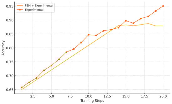 The inclusion of synthetic data in the training process addressed the common challenge of limited experimental data, resulting in a more robust and accurate model. The improved performance metrics demonstrate the value of data augmentation through FEM simulations. As shown in the learning curves (Figure 7), the UNET+ model trained on the FEM + experimental dataset exhibits steady improvement in accuracy throughout the training steps, reaching a final accuracy of approximately 0.88. In contrast, the model trained solely on the experimental dataset shows signs of overfitting, with accuracy plateauing and fluctuating around 0.85 after 10–14 steps. This indicates that while the model initially learns from the limited data, it eventually starts to memorize the training set rather than generalize to new data.