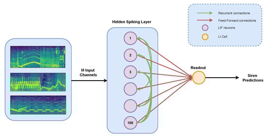 We adopted the model architecture from our previous work in [7,28] to achieve predictions using a recurrent spiking neural network, as shown in Figure 2. Recurrent networks were chosen as they exhibit excellent ability to handle time-series data much better than feed-forward networks. Recurrences aid to excelling in tasks that need to uncover the realms of contextual understanding such as audio processing. The SpikeSireNet model comprised a hidden layer with 100 spiking leaky-integrate-and-fire (LIF) neurons with recurrent connections. For our experiments with sliding-window variation and time constants, we adopted a homogeneous network structure with parameters specifically from our research work on designing a model to detect siren sounds in [7]. With the aim to understand the impact of dataset augmentation, we further slightly modified the design of the SNNs in terms of input features and neuronal time constants of the hidden layer. The network in Figure 2 comprises a hidden spiking layer and a single readout for predicting siren or not. The information processing in the hidden layer of SpikeSireNet is in terms of spikes. LIF neurons are analogous to biological neuronal processing. When the input stimulus crosses the threshold voltage, neuronal firing occurs. We aimed to understand the effect of sliding windows and neuronal processing on network predictions with a great focus on the spectral feature components. Therefore, we conducted experiments with various membrane () and synaptic () time constants of the neurons to evaluate the impact of different windows on the task performance.