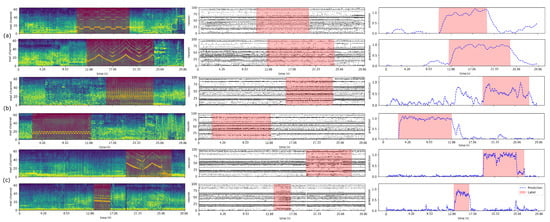 Feature resolution and their effect on performance. Demonstration of feature resolution on mel channels for sliding window variation on the anomaly detection task (presence of siren in each panel is highlighted in red). (a) First two rows: w = 4096 (h = w); (b) Next two rows: w = 2048 (h = 0.5 w); (c) Last two rows: w = 1024 (h = 0.25 w). The panels in each row showcase stages of information processing in the network pipeline of the proposed method. SpikeSireNet was trained on [18] for this set of experiments.