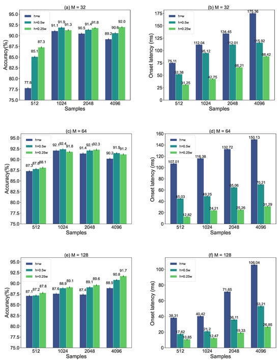 Sliding windows with different sample size impacts performance. Evaluation of SpikeSireNet for sliding window with mel channel variation on the anomaly detection task with membrane and synaptic time constants set to 2 s. (a) Introduction of hop length improves the prediction accuracy (b) Onset latency reduces for overlapping windows. From (a–f), the mel channel variation is seen from M = 32, 64 and 128 respectively. SpikeSireNet is trained on [18] for this set of experiments.