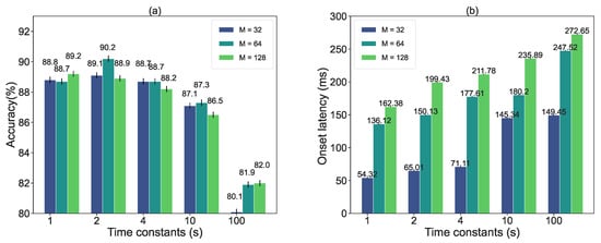 Some authors have shown the significance of time constants of spiking neuron models to help improvise the performance of spatio-temporal pattern recognition task [26]. Neurons tend to show the behavior which confirms that leakages exist in neuronal models as underpinned by biology and by authors in [24,25]. The relation between the leaky behavior of spiking neurons in terms of exponential decay as time constants and that of the sliding windows was understood step-by-step through experiments in this work. At a higher level of abstraction we understood the variation of sliding windows and the impact on onset latency and accuracy for various time constants (in this case, keeping ). With smaller neuronal time constants, the response time of neurons was faster. The obtained prediction accuracy was highest for overlapping windows and thus led to faster processing speed. It is noteworthy, as the time constants fell in the range of audio sequences, this adversely impacted the accuracy by nearly 10%. We also noted that for smaller time constants and smaller windows, accuracy and onset latency were 5.5% higher and lower, respectively, in contrast to higher time constants.