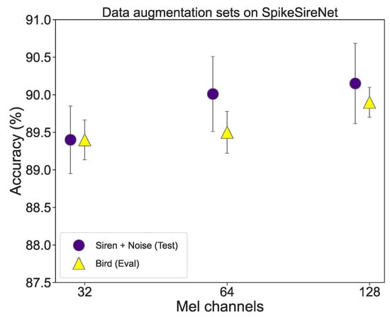 Figure 6 explains the accuracy obtained for each of the settings. Enriching data with various data augmentation techniques represents a true real-world scenario. This helps in real-time acoustic emergency detection task, and contributes towards model robustness to unknown environmental actors. The baseline dataset with siren + noise samples was trained, and the test accuracy was marked as purple circles (see Figure 6). The pre-trained model was presented with the evaluation dataset consisting of samples from the Bird dataset introduced as a noise class (see Figure 6 marked by yellow triangles) alongside the siren dataset. With increasing mel bins, the performance improved. As the augmented dataset for evaluation was challenging because of the various noises and sounds like bird chirps, insect calls, rain, wind, etc., the performance increased only slightly. The distribution of noise and siren samples was uneven, and this might have impacted the performance. Given the challenges in the evaluation dataset and the fact that the model was not trained on the bird data, SpikeSireNet performed well towards the new unseen samples, therefore explaining the better accuracy values than for the bird augmented dataset. From the small variation between accuracy values, it was inferred that the model stabilized to siren and non-siren signals well and cross-data generalization was achieved.