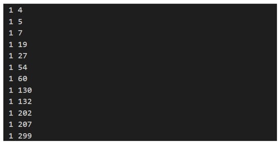 This section reviews the steps and results of this empirical study’s experiments using the dataset by Jethava and Rao [], previously utilized by Patel and Mistry []. First, data were cleansed and reformatted so they could be used to train different ML algorithms to detect Sybil nodes. The Twitter user dataset consists of followers and followees, i.e., it indicates what accounts each account follows. Figure 3 signifies part of the Jethava and Rao [] dataset, indicating that user ID 1 is following 4, 5, 7, etc., up to the end of the dataset.