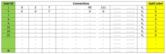 For example, the first row shows data for user 1, followed by 2, 7, 90, and 111, which are labeled as Sybil users. The second row corresponds to user 5, followed by user 7, which are legitimate users. The matrix continues to include all users in the dataset [] and their connections. In the second-to-last column (on the right side of the table in Figure 4), an “X” indicates either the node with the highest index or zero if the node is not followed. This is denoted by , where , and M is the value of the highest index among the sorted nodes before being included in the matrix (See Algorithm 2).
