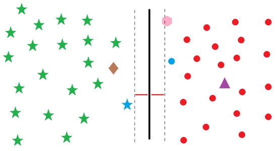 SVM, a supervised learning algorithm, operates on labeled datasets, aiming to learn a hyperplane that separates data points into distinct classes []. Its training optimizes the hyperplane’s position for effective classification of new points []. When assessing a new point’s position relative to the hyperplane, SVM assigns it to an appropriate class. In Figure 5, the hyperplane visually separates red dots from green stars, with dashed lines indicating the distance between the hyperplane and the nearest support vectors [,]. Such support vector positioning during training determines the hyperplane’s position and margin size []. In this testing phase, the hyperplane functions as the class boundary [], classifying new instances. SVM’s hyperplane is crucial for classification and regression tasks, predicting class or value for new instances, relying upon the new instance’s position with respect to the hyperplane [,].