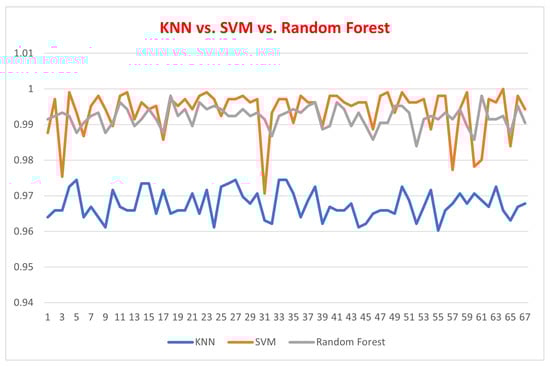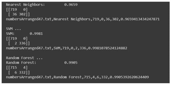 This study generated a single matrix for training ML algorithms, followed by experiments to optimize accuracy. Due to the dataset’s extensive size, a need arose for significant computational resources, e.g., supercomputers, but, lacking access to one, we split the data into seventy-one samples to generate corresponding smaller matrices for training and testing. Such an approach eased the computational demands, crucial due to the initial matrix’s massive 117 GB size. Each of the seventy-one matrices was approximately 299.62 MB, totaling 20.77 GB. Despite such a size reduction, the original data remained intact and, as a result, were organized into independent matrices, thus enhancing manageability and computational feasibility. Next was the ML algorithm phase in this study, where ML algorithms were deployed, i.e., KNN, SVM, and random forest algorithms, and the respective training was conducted to differentiate Sybil nodes from legitimate nodes on the previously mentioned seventy-one matrices. In the next section, this study reports the distinct accuracy outcomes of each algorithm. While training, a challenge was encountered when training the SVM on four matrices once extensive training times elapsed, though KNN and random forest trained successfully. Hence, this study opted to analyze the algorithms’ results on sixty-seven matrices omitting the four problematic ones. All ML algorithms utilized the aforementioned seventy-one matrices as the input for training. Segmented data blocks served for training and testing, yielding high accuracy. The algorithms produced a uniform output format, enabling direct comparison with their outputs represented by a 2 × 2 matrix (Figure 9).