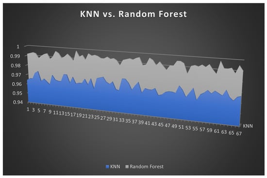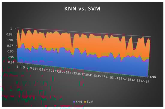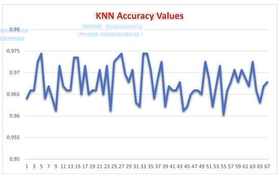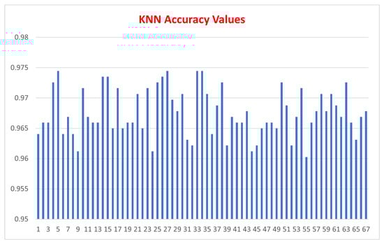 Figure 10 and Figure 11 depict the KNN accuracy results for the different matrices. As depicted, the accuracy had a maximum of approximately 97% and a minimum of around 96%.