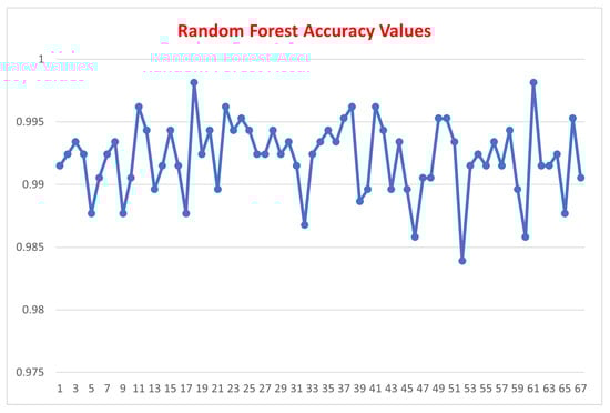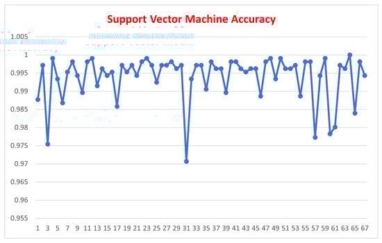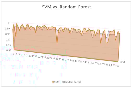 Figure 12 and Figure 13 depict the accuracy for the random forest algorithm and the SVM algorithm, respectively.