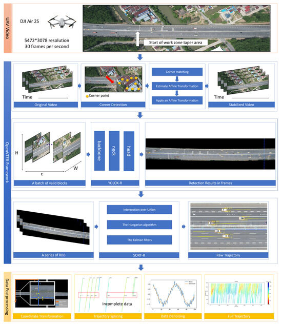 In the wzone dataset, 29 videos were recorded using DJI Air 2S drones, which feature a 1-inch CMOS sensor with a pixel size of 2.4 μm. The videos were captured in 5.4 K (5472 × 3078) resolution at 30 fps, providing high-definition footage for precise trajectory extraction. The video processing procedure is shown in Figure 1.