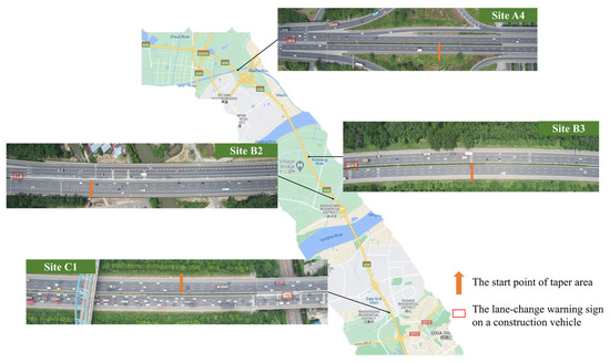 The work zone sites are located northeast of Nanjing on the G36 highway. Generally, there is a construction vehicle with a lane-change warning sign, shown at the video’s endpoint. And the taper areas usually start 150–200 m ahead of the construction vehicle, as shown in Figure 3. To investigate the vehicle merging characteristics under different traffic states and layouts, in this study, we selected eight work zone sites to form three scenarios, which are described in Table 1.