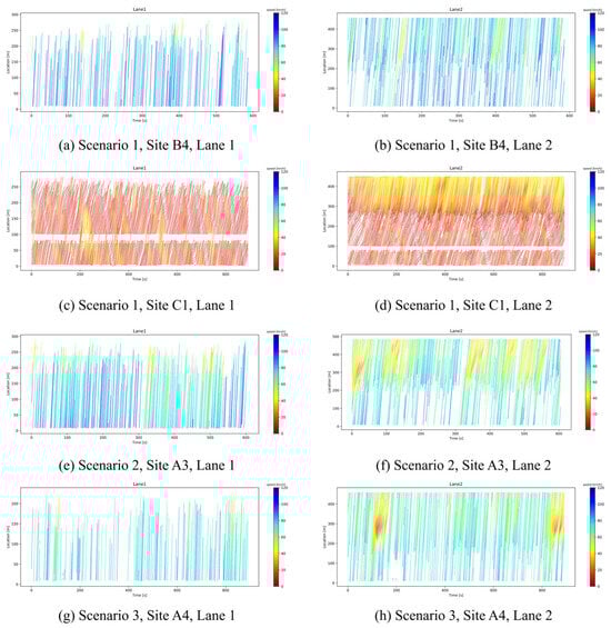 - Scenario 3: This scenario involves a two-lane configuration where traffic oscillations are observed, as shown in Figure 4g,h. With only one open lane, vehicles must either accelerate or yield to merging traffic, but they lack the option to make discretionary lane changes to another lane, as is possible in Scenario 1. The layout of this work zone creates additional complexities in merging behavior, which will be discussed further in the next section.
