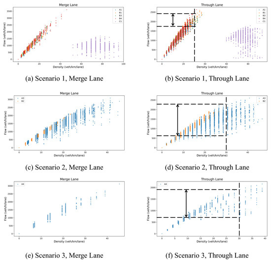 In Scenario 2 and Scenario 3, the through lanes cover a more extensive range of regions on flow–density diagrams than in Scenario 1. When the density is 30 veh/km/lane, the flow rate range in Scenario 1 is about 700 veh/h/lane, while under the same density, the fields in Scenario 2 and Scenario 3 are about 1700 veh/h/lane and 1200 veh/h/lane, respectively. Regarding the trajectory plots in Figure 3, under similar density levels, more oscillations occur in Scenario 2 and Scenario 3 than in Scenario 1. That may be due to the behavior of merging vehicles in the merging lane. With the density increase, the behavior of merging vehicles is more likely to interfere with the speed of vehicles in the through lane, causing deceleration of subsequent vehicles and traffic oscillation.
