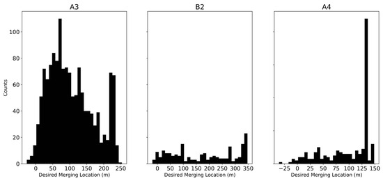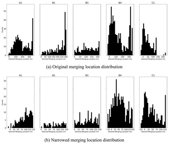 The merging location distribution of Site A3 is notably similar to that of Site B4, with the primary difference being that vehicles at Site A3 tend to merge approximately 70 m closer to the taper. This slight variation can be attributed to the differences in traffic conditions or road layout. Interestingly, despite the presence of a solid white line at Site A4, which typically limits early lane changes, a large proportion of vehicles still tend to merge early. This suggests that, even with road markings discouraging lane changes, drivers in low-density traffic prefer to merge as soon as they perceive a safe opportunity. The distribution pattern from 50 m to 150 m observed across several sites reinforces this trend. To ensure representativeness, we chose Site B4 as a key reference for Scenario 1 due to its large sample size and similar traffic volume to Site A3, allowing for more robust analysis across comparable conditions.