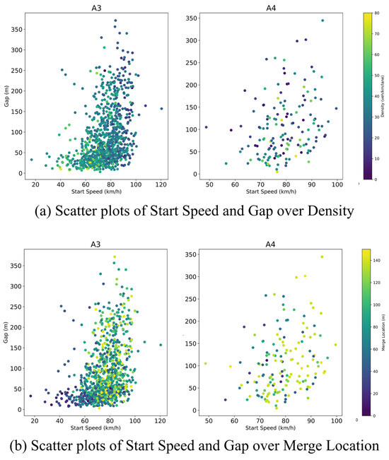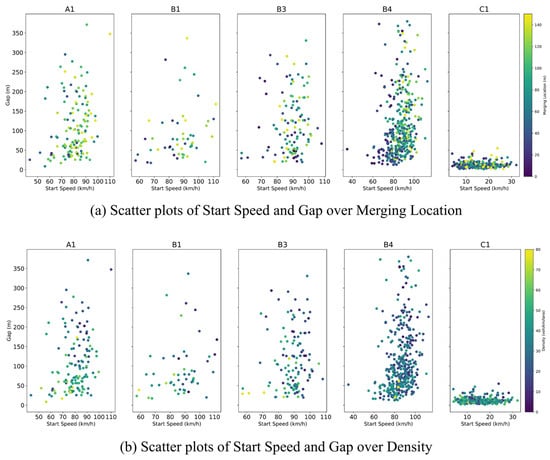 Figure 7a,b show the relationship between the speed when merging starts () and the accepted gap (). The colors on the scatter points represent the merging location of the vehicle in Figure 7a and the density in Figure 7b. When colors are not shown, we may wrongly conclude that the start speeds of vehicles are insensitive to gap size because there is no apparent trend between the start speed and gap distribution. The colors in Figure 7a show that the merging vehicles select a smaller gap with a lower speed under a light traffic flow rate. And when facing a particular gap, vehicles tend to merge at a slower pace as they approach the taper. And the density color indicates that vehicles take a shorter gap with relatively low speed when surrounded by other vehicles and have more gaps to choose from when density is low. However, in congested traffic states, vehicles are forced to accept gaps under 50 m and start merging at a speed of less than 30 km/h, regardless of how far away from the taper area.