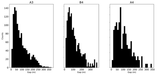 Gap distribution of Scenario 2 and Scenario 3. Sites A3 and B4 exhibit more defined peaks, while Site A4 has a more uniform distribution, likely due to its smaller sample size and lower traffic volume.