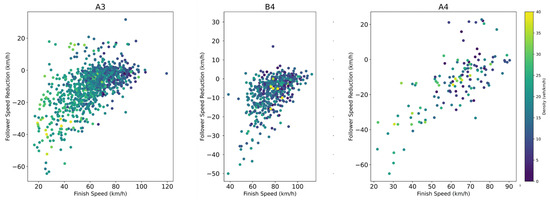 During the merging process, the speed series of the target follower of the merging vehicle is extracted. Three parameters involved in the follower’s speed change are counted in Table 4. “Delta” denotes the difference in the follower’s speed between the end and the beginning of the series. “Std” represents the standard deviation of the speed series. And “Range” means the difference between the maximum and the minimum of the value in the series. The change in the follower’s speed reflects the merging impact on the surrounding vehicles. In this study, the negative effect on the follower in the open lane is the largest on a two-lane highway. At Sites A3 and A4, the merging vehicle can result in the most considerable deceleration of its target follower by about 65 km/h, and oscillations or accidents are more likely to occur in Scenarios 2 and 3. The relationship between the finishing speed of the merging vehicle and the impact on followers’ speed decrease is shown in Figure 11. The distributions at Sites A3 and B4 are similar, but at Site A3, with density increases, the merging vehicle would lead to a more significant speed reduction and lower finishing speed. The relationship at Site A4 is approximately linearly distributed, which means that the impact on the target follower is more deterministic than in a three-lane highway work zone.