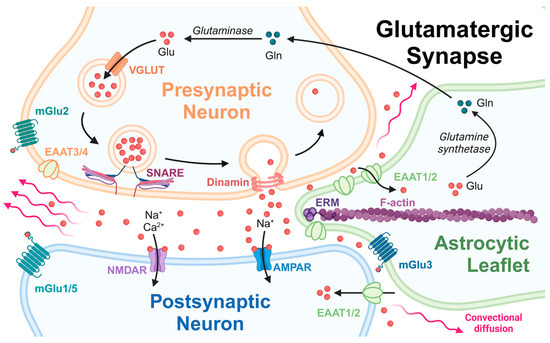 The scheme of a glutamatergic synapse in the central nervous system (CNS). Created with BioRender.com.