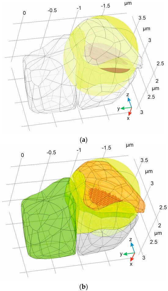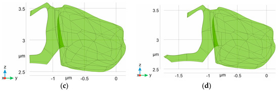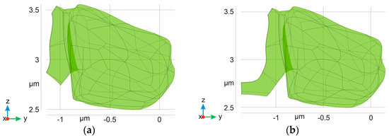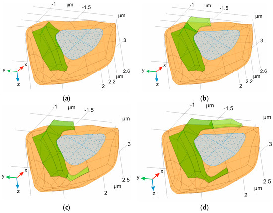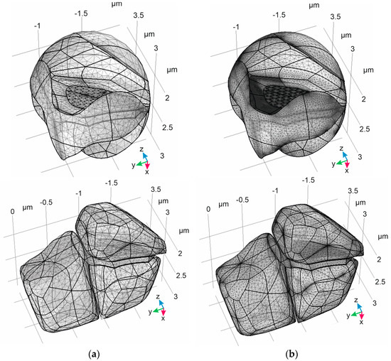 Several examples of various meshes are shown in Figure 7, which were all generated using the COMSOL Multiphysics software. The results of the algorithm are considered acceptable for applications demanding both coarse and extra fine meshes, with examples of both further represented in Figure 7. Their main characteristics are quite different. In particular, the maximum element size is about 0.14 μm in the coarse mesh, compared 0.03 μm in the extra fine mesh. Furthermore, the minimum element size is 0.04 μm in the coarse mesh, compared to 0.002 μm in the extra fine mesh. The number of elements is also observed to present a significant difference—0.2∙106 (coarse) versus 1.6∙106 (extra fine). However, both types of mesh can be created in the obtained domains. The means that the model can be evaluated with the appropriate calculation resources and at the desired level of quality.