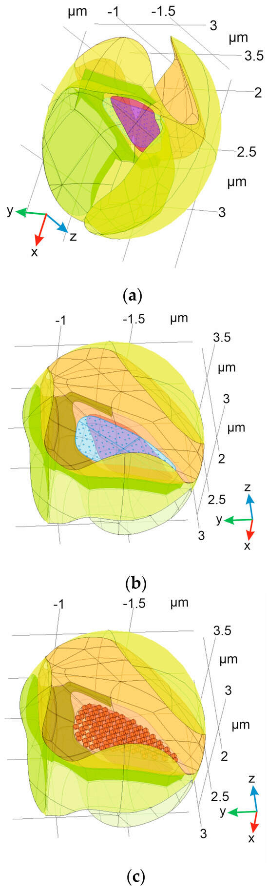 The results of applying the described Boolean operations and procedures allowed us to obtain a placed set of domains corresponding to the initial biological structures in a one-to-one manner. The functional features of the final structure are the true-distance localization for not only the neuronal membranes, but also for the astrocytic leaflet and presynaptic vesicles (𝜕Ωifusion) on the membrane (Figure 2). The localization of the vesicles indicates the possible locations of neuromediator release, and should be considered as possible areas of incidental connection of some vesicles with further opening and the release of their internal pool. The number of the attached vesicles is also a subject of discussion. The conventional reaction–diffusion of neuromediators out of a synaptic cleft will be modeled in the ISF domain (Figure 3a–c) with consideration of 𝜕Ωifusion (Figure 3b). However, it is also possible to consider the full values of the inter-vesicle pool, including the spheric domains directly (Figure 3c). In such a case, one must consider a physical problem with time-dependent emptying of the vesicles. It is essential to consider that the localization of the attached vesicles can differ, and there is a chance that both neighbor and distant connections appear.