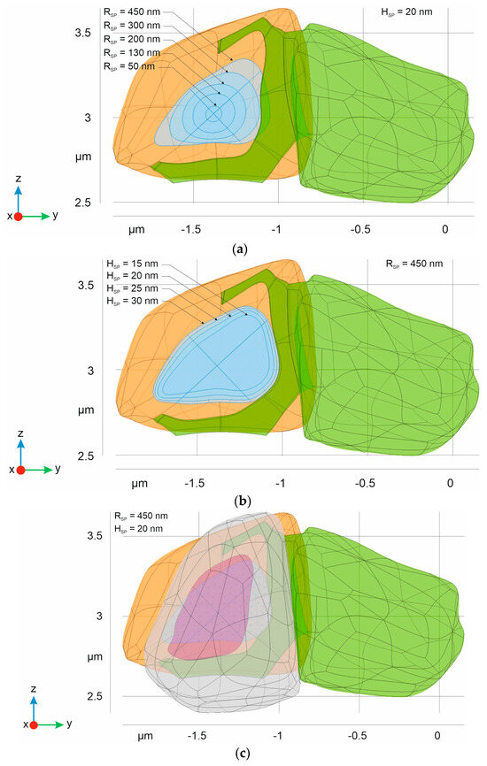 The differences in AZ are presented in Figure 4. The results clearly indicate a profound enlargement and change in the shape of the AZ with an increased radius RSP. At the same time, the height of ΩSP is not a crucial parameter affecting the size of AZ under the same radius. Additionally, although the PSD area is similar, it is not equivalent to the AZ.