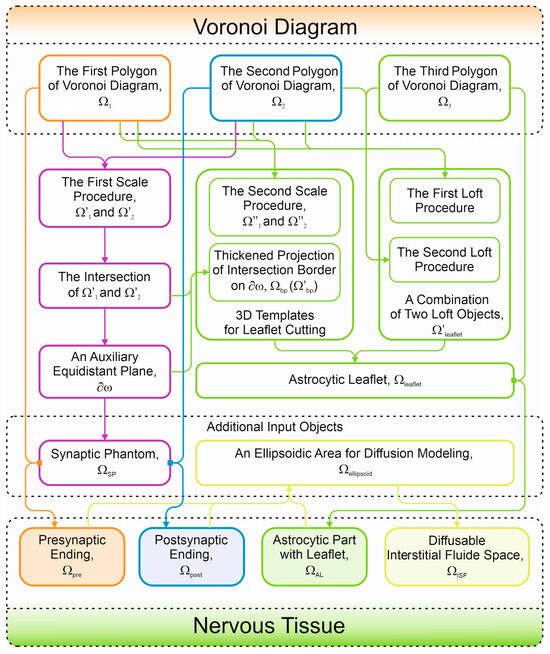 In the present study, we proposed an algorithm for the creation of digital synaptic phantoms. The main advantage of the introduced method is its careful consideration of the astrocyte/neurons area, using scaled distances between the membranes. The final form of the phantom includes smoothly shaped AZ and PSD surrounded by the astrocyte leaflet in a fluent manner. The step-by-step procedures of digital phantom creation are represented in Figure 8. It is essential that the set of initial bodies is selected without any special assumption about the geometric shape. This can be performed according to the automatic generation of 3D Voronoi diagrams in any appropriate software package. As only three closest neighbors and an including ellipsoid are required, the presented steps are universal and highly adaptive to various programming demands. Although the process of creating an astrocytic leaflet is precise, the overall formation of the final phantom can be carried out rapidly. As mentioned above, a created digital phantom is suitable for convectional reaction–diffusion modeling; in particular, the phantom designed according to the introduced algorithm will be of Class I, according to the H/H classification [70].
