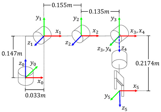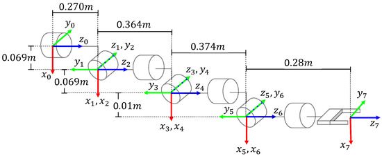 where the parameters , , , and represent the joint angle, link length, link offset, and link twist, respectively. The parameter becomes the joint variable for revolute joints. In contrast, the parameter becomes the joint variable for prismatic joints. In both cases, the rest of the parameters remain constant.