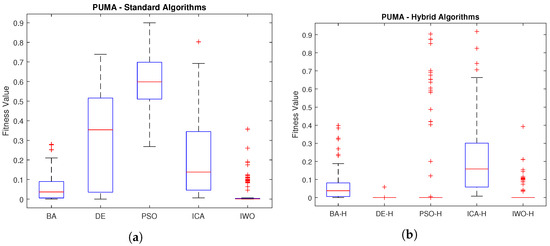 Comparisons aim to analyze the statistical variation in the results of each algorithm. Boxplot graphics are used as a visual aid to identify the algorithm with the lowest variability, characterized by lower dispersion and lower fitness function values. A lower fitness value corresponds to smaller errors in both position and orientation. Moreover, lower fitness values indicate that joint values are feasible, as no penalties are applied. The results are presented using statistical measures such as mean, standard deviation, and the best and worst outcomes of each algorithm, all of which are summarized in tables.