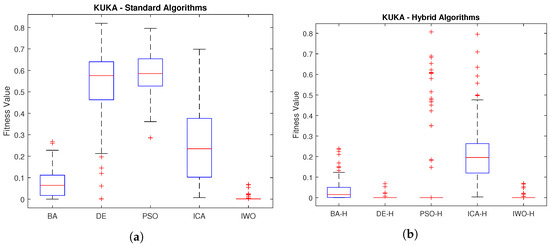 Finally, Figure 7 presents the simulation results of KUKA iiwa robot. Figure 7a displays a boxplot of the error obtained by the standard algorithms, while Figure 7b shows a boxplot of the performance of the hybrid algorithms. The distribution comparison indicates that hybrid algorithms perform better, with DE and IWO demonstrating similar performance. Table 7 reveals that DE hybrid algorithm (DE-H) achieves the most significant improvement for the KUKA iiwa Robot.