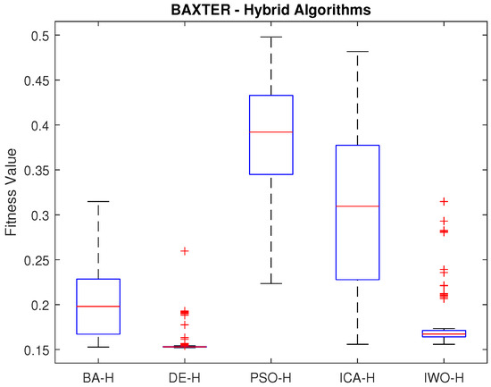 Figure 6 illustrates the simulation results for the 7 DOF Baxter robot. Figure 6a shows the data dispersion of standard algorithms, while Figure 6b demonstrates that the hybrid DE algorithm achieved the best result. Table 6 compares the statistical measures obtained by the algorithms in solving the inverse kinematics of the Baxter robot. Similar to the previous case, the hybrid DE algorithm (DE-H) exhibits the best performance.