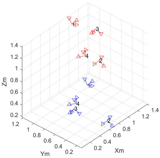 The desired end-effector poses are defined with a set of 100 random positions and orientations generated in a valid workspace for the robotic manipulators, as shown in Figure 4. All random poses are reachable. Moreover, the proposed approach runs for every randomly desired pose independently. The best fitness value of each run is kept for statistical analysis.