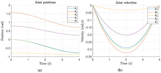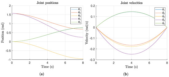 Time history with a cubic polynomial timing law for Experiment 1. (a) Joint positions. (b) Joint velocities.