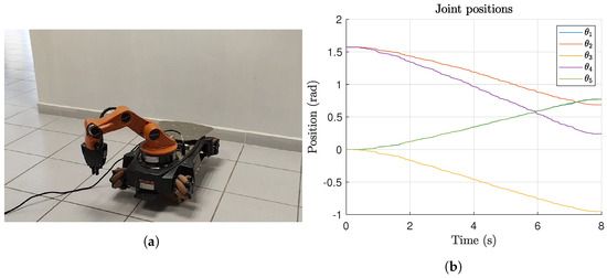 A 5 DOF KUKA YouBot was used for experimentation, as shown in Figure 10. The DH parameters are provided in Table 11 and the coordinate frame assignment is presented in Figure 11. The proposed algorithm was implemented using Matlab and the ROS environment. ROS components on the KUKA YouBot provide an internal PID controller in the joint space, which is convenient for the considered trajectory planning. A point-to-point trajectory planning is performed on an external computer with Matlab and the ROS toolbox.