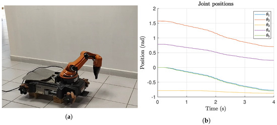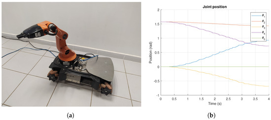 KUKA YouBot final joint configuration for Experiment 1. (a) Real-world final joint configuration. (b) Joint motion results measured by encoders.