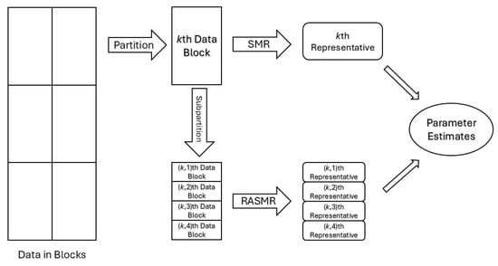 Corollary 2 ensures that and can be used to approximate the original value of and , and the error vanishes along with the maximum size of data blocks. Both SMR and RASMR algorithms can be used to generate and , but numerical experiments overwhelmingly favor RASMR as it improves both the parameter estimates and the representatives.