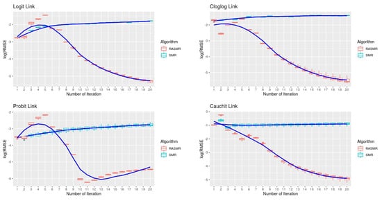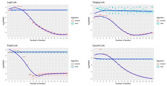 For Bernoulli regression models (see Example 1 in Section 4.2), we consider four commonly used link functions, namely logit, cloglog, probit, and cauchit. We first simulate data points from each of the seven distributions, respectively, under the logit link. We then obtain the data blocks using K-means clustering with . By assuming each of the four link functions, we obtain the corresponding parameter estimates using the MR, SMR, and RASMR algorithms, respectively. We then compare the estimate with the full data estimate under the corresponding link function. The performance of estimation is measured by the root mean square error (RMSE, that is, ). A smaller RMSE indicates a better approach.