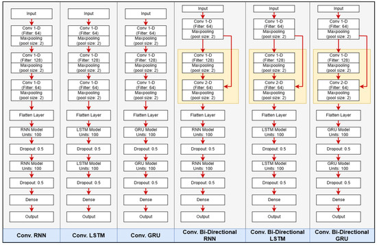 Architecture of Conv. RNN, Conv. LSTM, Conv. GRU, Conv. BRNN, Conv. BLSTM, and Conv. BGRU.