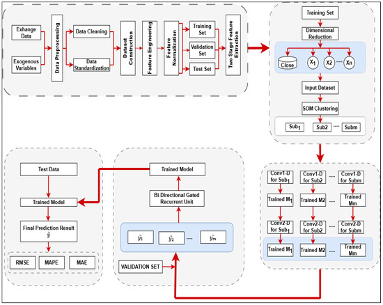 An extensive literature review is conducted to identify several effective deep learning architectures commonly employed for time-series data modeling and prediction. The subsequent phase involves collecting time-series data from actual-world situations after a diverse array of architectures has been acquired. The third stage of this study consists of pre-processing the collected dataset, which involves normalizing the values based on the various ranges of current stock indices values. This article proposes a hybrid architecture to predict the close price of the Asian Stock Exchange. The architecture incorporates the random and temporal fluctuations of the exchange rate and the vulnerability to external market dynamics. A two-stage feature extraction technique is employed on the dataset to streamline the architecture’s creation process and improve its capacity to accurately predict outcomes beyond the data it was trained on. This is necessary because of the abundance of influential factors and the unpredictable nature of exchange rates. One application of Auto-Encode (AE) is to simplify complex elements involved in influencing. Due to the volatility of stock exchange rates, the Self-Organize Map (SOM) is employed to cluster related data from the training set into one category. The Convolutional Neural Network (CNN) addresses traditional neural networks’ limitations in effectively extracting features from time-series data. Due to its capacity to accurately predict based on time-series data, it is a highly potent tool. Bi-directional Gated Recurrent Unit is recognized as a very accurate and effective technique for non-linear integration, as it excels in accurately considering the weight of each propagation to predict the close price of Asian stock indices as shown in Figure 2.