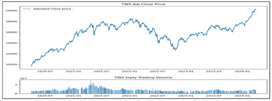 As mentioned earlier, this study utilizes time-series data from the financial field. Based on results from the prior research [15,29] that showed the interdependence of these stock indices’ movements, this study integrates data from six stock indices into a single multivariate dataset. Utilizing a multivariate modeling technique considers the impact and interrelation of various stock markets, leading to more accurate outcomes. Figure 3 shows the daily fluctuations of stock market indexes in India, while Figure 4 displays similar data from Hong Kong. Figure 5 presents the data from Taiwan, and Figure 6 illustrates the data from Indonesia. Figure 7 presents the data from Japan, and Figure 8 illustrates the data from Korea.