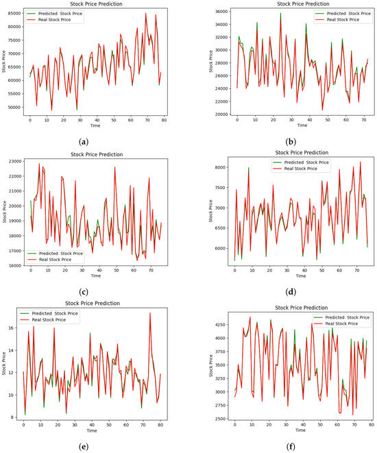 From Figure 10a–f, the predictions made by the BGRU model for all six Asian exchange markets stock markets on 31 March 2024 are shown. To summarize, the assessment of the six deep neural network models demonstrates the ability to accurately replicate the observed patterns of index value fluctuations in the six Asian stock exchanges. On the other hand, the expected yield curve shows a significant difference compared to the original value curve. Compared to the different exchange markets, the BGRU model produces the TWII index curve, which exhibits the most significant deviation from the original value curve in Figure 10c. Conversely, the BGRU model produces the BSE prediction curve that resembles the original value curve in Figure 10a. Figure 10c displays a variety of possibilities depicted on the Taiwan stock market chart. The prediction curve of TWII has the highest level of deviation from the original value on this graph compared to the curves of the other exchange markets. The BGRU model accurately creates the prediction curve for the KS11 as shown in Figure 10f. In addition, BGRU achieves the highest accuracy in predicting the curve for JKSE, while the BSE exchange remains an excellent performer for BGRU. These data show that none of the six Asian exchange markets under study have the highest level of prediction accuracy.